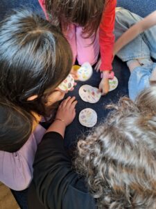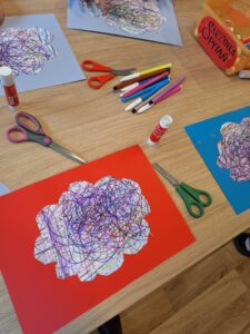 Dziś było dużo zabaw z muzyką. Wczuwaliśmy się w różne role i poruszaliśmy się do muzyki. Rysowaliśmy muzyczne bazgrołki, które później zmieniły się w baranki z naszymi imionami. Okazuje się, że każdy z nas ma w sobie różne kolory, nastroje, pomysły i marzenia. Muzyka też wyznaczała nam czas na przekazywanie pudełka z zdaniami. Kto je trzymał w dłoniach, gdy zamilkła muzyka, musiał wykonać jedno z zadań z pudełka. Mieliśmy też czas na planszówki i niekończące się rundy naszych ulubionych gier. Dzień zakończyliśmy słuchaniem kolejnej części książki "Ronja, córka zbójnika".