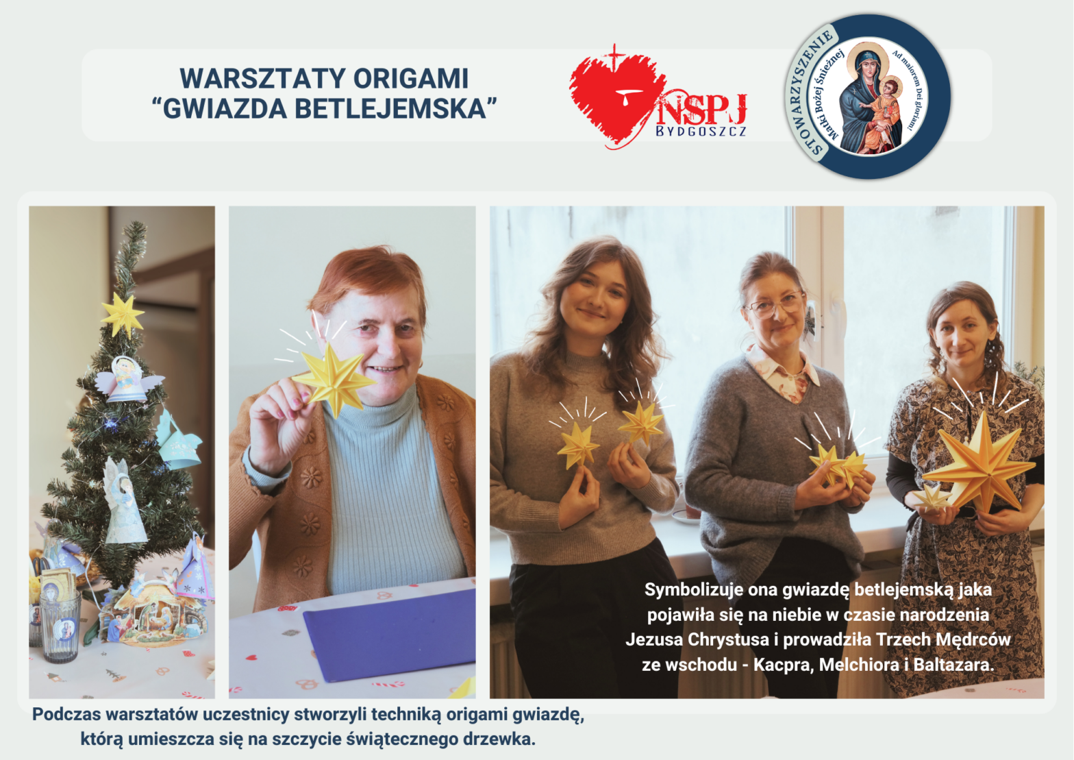 W sobotę 10.01.2026 r. Stowarzyszenie „Matki Bożej Śnieżnej” we współpracy z naszą parafią zorganizowało coroczne warsztaty z origami „Gwiazda betlejemska”, przeznaczone dla małych grup do 5 osób. Wydarzenie jest doskonałą formą integracji międzypokoleniowej. To również okazja do rozwijania kreatywności. Skomplikowane i staranne złożenia papieru wymagają cierpliwości i skupienia. Podczas warsztatów uczestnicy stworzyli techniką origami gwiazdę, …