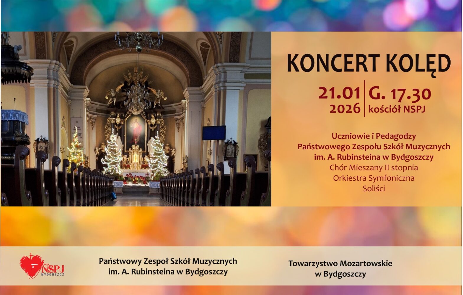 Parafia NSPJ w Bydgoszczy, Państwowy Zespół Szkół Muzycznych w Bydgoszczy oraz Towarzystwo Mozartowskie w Bydgoszczy zapraszają na koncert kolęd. Wykonawcy: Chór Mieszany II stopnia Orkiestra Symfoniczna Dyrygent i przygotowanie chóru – Aleksandra Grucza-Rogalska Dyrygent i przygotowanie orkiestry – Henryk Wierzchoń Organy – Szymon Kamiński Solistki – Rozalia Ciaciuch, Marta Kubiak, Małgorzata Manthey, Weronika Niedbalska, Zauzanna …