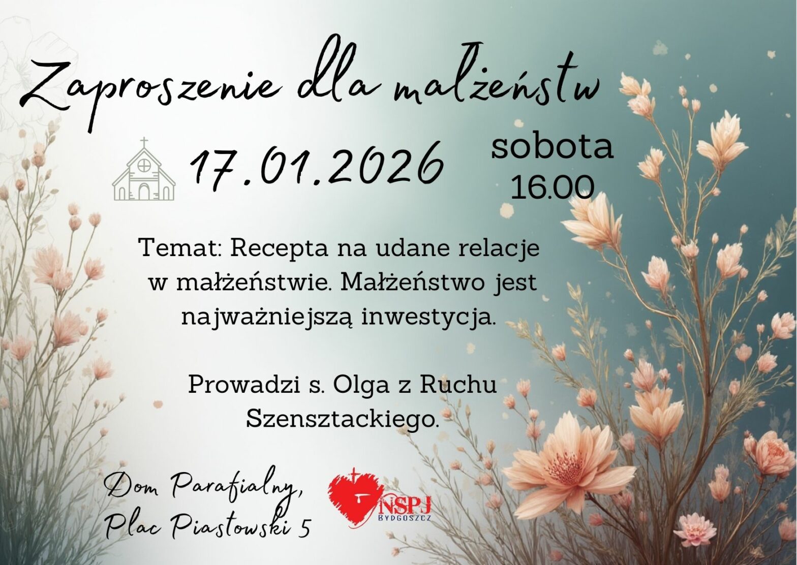 Zapraszamy chętne małżeństwa z różnym stażem na spotkanie w sobotę 17 stycznia o 16.00 – 18.00. Temat: Recepta na udane relacje w małżeństwie. Spotkanie w domu parafialnym. Małżeństwo jest najważniejszą inwestycją. Prowadzi s. Olga z Ruchu Szensztackiego, która od 10 lat towarzyszy małżonkom.