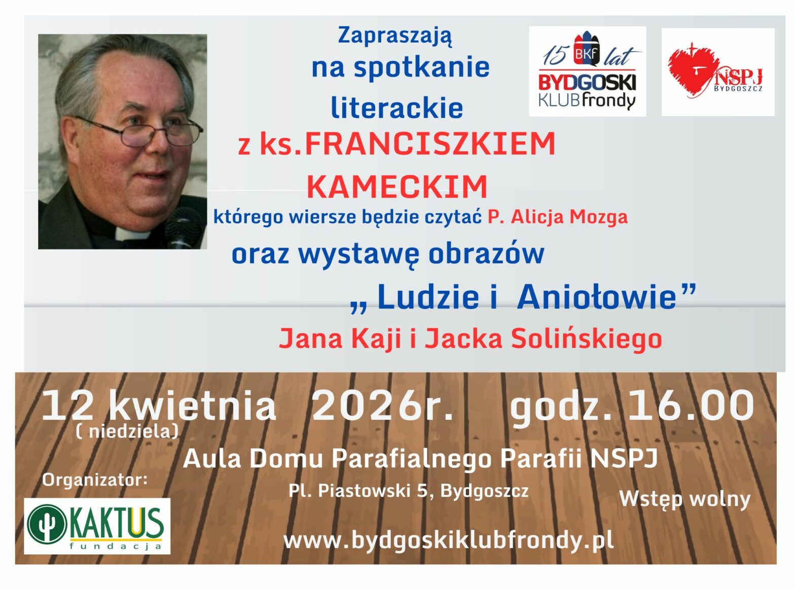 Bydgoski Klub Frondy i Parafia NSPJ, zapraszają na spotkanie literackie z ks. Franciszkiem Kameckim, którego wiersze będzie czytać P. Alicja Mozga oraz na wystawę obrazów pt. „Ludzie i Aniołowie” Jana Kaji i Jacka Solińskiego. Spotkanie odbędzie się 12 kwietnia 2026r. (niedziela) o godz. 16.00 w Auli Domu Parafialnego Parafii NSPJ, Pl. Piastowski 5, Bydgoszcz. Wstęp wolny.
