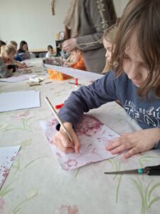 Po powrocie i wspólnym obiedzie, P. Magda przygotowała dla nas wyjątkowe zadanie. Dzień stał się jeszcze bardziej kolorowy, kiedy zaczęliśmy eksperymentować z kolorową pianą. Przenoszenie jej na kartki okazało się nie tylko świetną zabawą, ale i sposobem na wyrażenie siebie. Każdy z nas, patrząc na swoje kartki, wyobrażał sobie różne postacie i krajobrazy, co pokazało, jak różnorodne są nasze wyobraźnie.