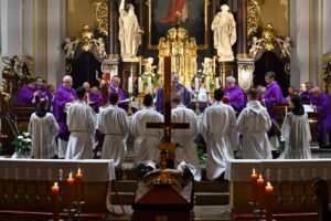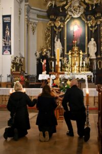 We wtorek, przy biciu dzwonów, do naszego kościoła została wprowadzona trumna z ciałem śp. ks. prałata Romana Kneblewskego. Mszę św. celebrował wikariusz generalny diecezji ks. kanonik Tomasz Cyl, a koncelebrowali koledzy zmarłego. Pan Bóg powołał do siebie ks. prałata Romana dzień po jego 72 urodzinach, w 36 roku kapłaństwa, w Wielką Środę - powiedział celebrans w homilii. Ks. prałat Roman, syn tej parafii i jej pasterz, dał się poznać jako żarliwy kapłan, którego cechowały miłość do ludzi, kościoła, a szczególnie do naszego "Bydgoskiego Sacré-Coeur" i ojczyzny -dodał celebrans. Na zakończenie Mszy św. sprawowanej w intencji zmarłego celebrans odmówił modlitwy nad trumną zmarłego ks. prałata Romana. Wtorkowe uroczystości pogrzebowe zakończył Różaniec św. prowadzony przez Wiernych Tradycji Łacińskiej „Salus Populi Romani”. W środę o godzinie 12.00 modlitwa Regina celi i Różaniec św. O 13.00 Msza św. w kościele, a następnie pogrzeb zmarłego ks. prałata Romana na cmentarzu parafialnym.