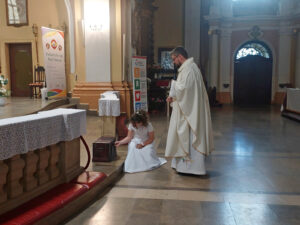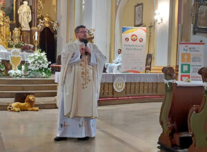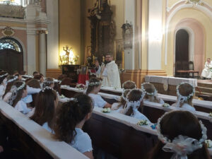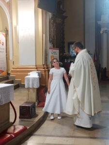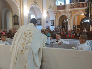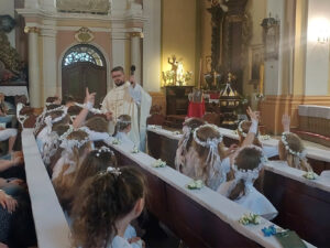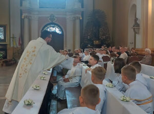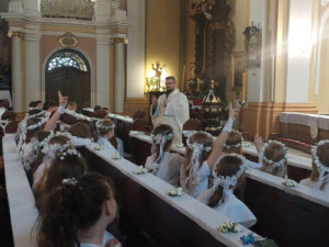 We wtorek 28 maja z dziećmi pierwszokomunijnymi spotkał się ksiądz Michał Borowski, aby zaprosić je do ERM.