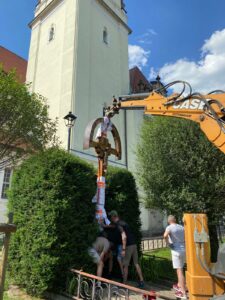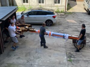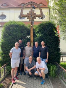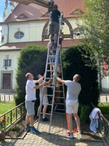 Wrócił nasz krzyż misyjny, po gruntownej renowacji. Okazało się, że 100 lat mimo podejmowanych już we wcześniejszych latach prac remontowych, mocno go nadwyrężyło. Jednak nasza niezawodna i pełna zaangażowania ekipa techniczna - Paweł, Mariusz i Paweł, po wielu dniach mozolnej pracy: najpierw jego demontażu, później szlifowania, wypełniania ubytków, wzmocnienia konstrukcji, wreszcie zabezpieczenia lakierem i odnowienia pasyjki i tabliczek, zamontowała dzisiaj krzyż na swoim miejscu. Dziękujemy z całego serca, ciesząc się z tak wspaniałego upamiętnienia Misji Parafialnych z okazji stulecia istnienia naszej parafii. Przy okazji dziękujemy paniom Zosi i Alinie za zadbanie o teren wokół krzyża i całego kościoła.
