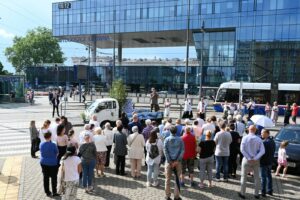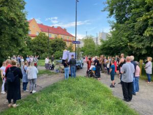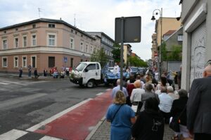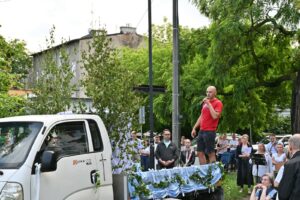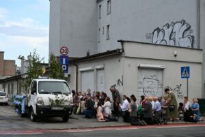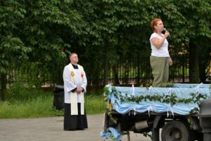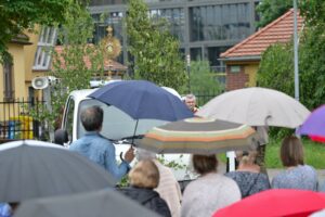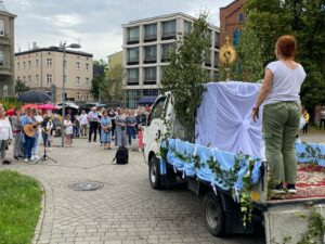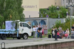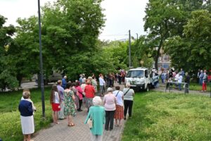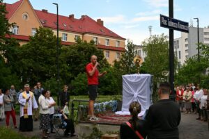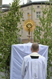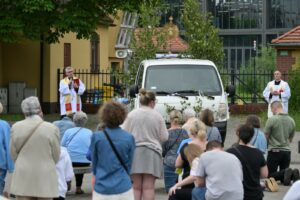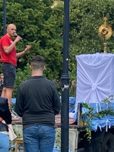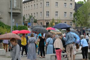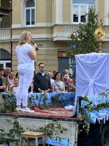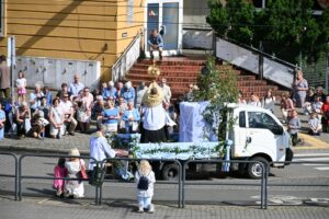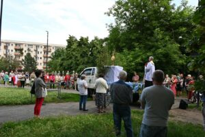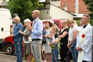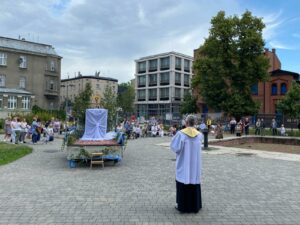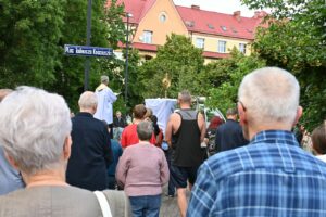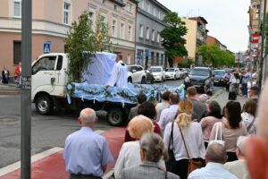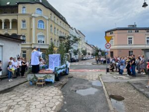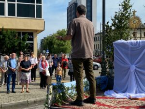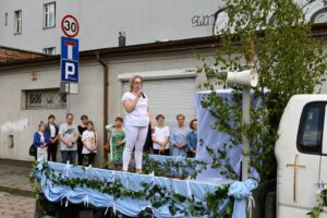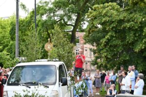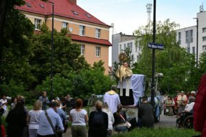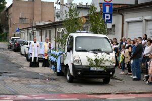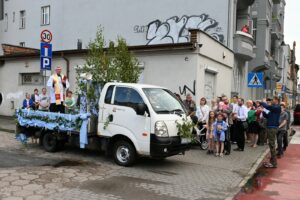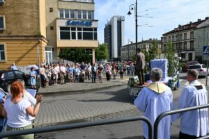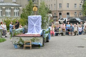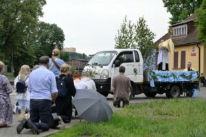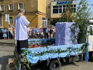 W niedzielę 2 czerwca 2024 uczestniczyliśmy w Eucharystycznej Procesji Wiary ulicami parafii. Do pierwszej stacji na parkingu przy dworcu PKP przyjechał udekorowany samochód, na którym znajdowała się monstrancja z Panem Jezusem. Zgromadzeni wierni wysłuchali Ewangelii, a następnie świadectwa wiary Adama. Po wielu latach grzesznego życia w czasie rekolekcji doznał spotkania z Panem Jezusem, które diametralnie odmieniło jego życie rodzinne i duchowe. Po świadectwie ksiądz Krzysztof udzielił zebranym błogosławieństwa Najświętszym Sakramentem. Druga stacja gdzie dojechał samochód z Panem Jezusem znajdowała się przy Placu Kościuszki, gdzie swoje świadectwo przedstawił świadek wiary, mówił o nawróceniu, na skutek wewnętrznego objawienia Pana Jezusa. Trzecia stacja znajdowała się u zbiegu ulic Kwiatowej i Pomorskiej. Część osób przemieszczała się wraz z jadącym autem z monstrancją. Tutaj świadkiem była Kinga, której życie się nie układało, chciała targnąć się na swoje życie. Trafiła do wspólnoty, do Pana Jezusa, co odmieniło jej życie i wiarę w siebie. Czwarta stacja była przy Bulwarach przy śluzie. Zebrani wysłuchali tak jak w poprzednich miejscach Ewangelii oraz świadectwa. Matka czworga dzieci, która wychowana w rodzinie bez miłości do kościoła stopniowo w czasie rekolekcji i spotkań w Wspólnocie Chwały odnalazła wiarę. Przełomem była ciężka choroba nowotworowa, operacja i uzdrowienie dzięki nieustannej modlitwie braci i sióstr z Wspólnoty Ogrodu Chwały. Po świadectwie tak jak przy poprzednich stacjach błogosławieństwo Najświętszym Sakramentem i zaproszenie ojca misjonarza do uczestnictwa w kolejnych dniach misji ewangelizacyjnych.