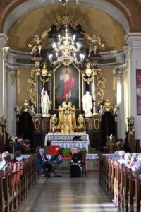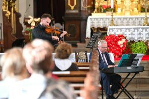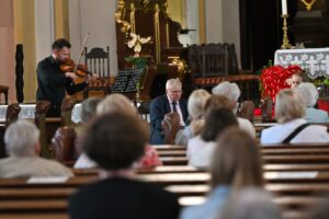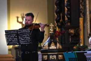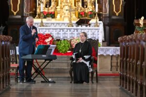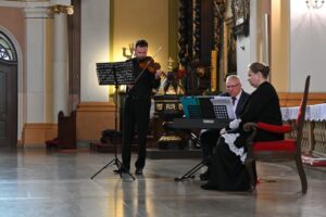 W sobotni wieczór w ramach Roku Jubileuszowego odbył się w naszym kościele koncert muzyki barokowej w wykonaniu Katarzyny Fraś – Mularczyk (sopran), Michała Marcinkowskiego (skrzypce) i Karola Marcinkowskiego (akompaniament). Barok w muzyce to okres od roku 1597 gdy włoski kompozytor G. Peri skomponował pierwszą operę ”Dafne” do roku 1750 tj. śmierci J. S. Bacha. Tym razem artyści zaprezentowali utwory najwybitniejszych kompozytorów tego okresu, włoskiego kompozytora wyświęconego księdza A. Vivaldiego (1671-1741 ) zwanego II Prete Rosso (Rudy Ksiądz), niemieckiego kompozytora G. F. Händela (1685-1759) i włoskiego kompozytora A. Stradella (1639-1682). W pięknym wykonaniu Pani Katarzyny usłyszeliśmy arie z oper Vivaldiego i Stradellego ( Agripina, Alcina, Sirosa, J, Cesar w Egipcie, Bajzet). Natomiast Pan Michał uraczył nas pięknymi wykonaniami sonat skrzypcowych Vivaldiego i Händela. Artyści swe utwory wykonywali przy wspaniałym akompaniamencie Pana Karola. Na bis artyści wspólnie wykonali utwór C. Francka. Serdecznie dziękujemy Pani Katarzynie Panom Karolowi i Michałowi za mile spędzony wieczór przy wspaniale wykonanej barokowej muzyce, która pięknie zabrzmiała w naszym kościele.