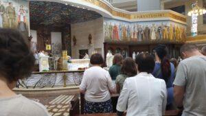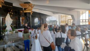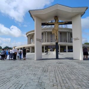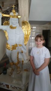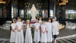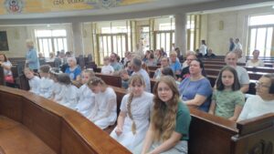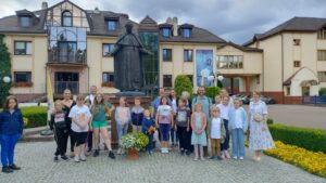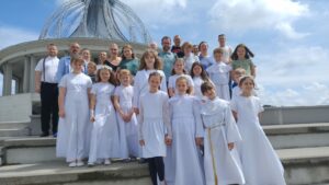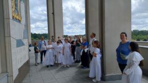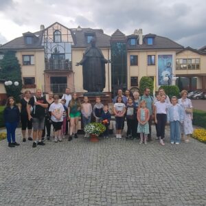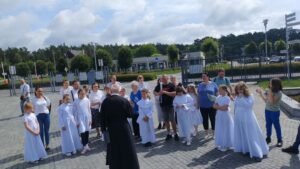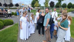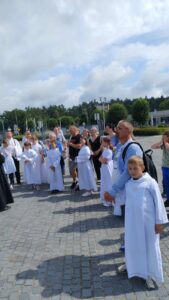 W sobotę 22 czerwca grupa dzieci, które w tym roku przystąpiły do Pierwszej Komunii Świętej wraz z księdzem Adamem udała się na Pielgrzymkę do Sanktuarium NMP Gwiazdy Nowej Ewangelizacji i św. Jana Pawła II w Toruniu. Kustosz przeprowadził pątników przez bramę, następnie oprowadził po kapliczce Maryjnej. Pokazał dzieciom piękną figurę Maryi, z białego marmuru sprowadzoną z Wietnamu a także relikwia świętych umieszczone na ścianie. Zainteresowanie wzbudzały witraże z Janem Pawłem II. Ksiądz Adam opowiadał o wizerunkach Maryi z różnych stron świata. W świątyni pielgrzymi odmówili różaniec oraz uczestniczyli we Mszy św. Był czas na kawę, lody i obiad, a potem wizyta w Radiu Maryja, gdzie dzieci na antenie odmówiły koronkę oraz miały możliwość pozdrowienia swoich bliskich. Zwiedziły nie tylko rozgłośnię radia, ale też studio telewizyjne. Ostatnim punktem pielgrzymki były tablice pamięci, które prowadzą na tężnie. Dla wszystkich uczestników był to bardzo owocny dzień, pełen wrażeń i pięknych chwil.