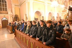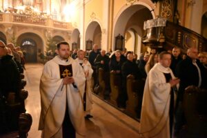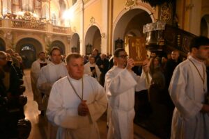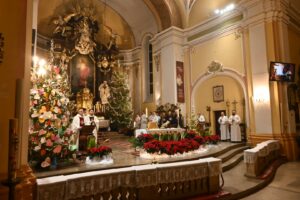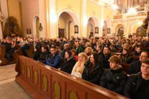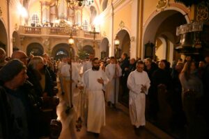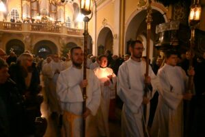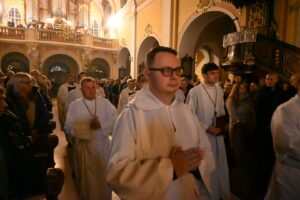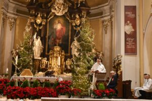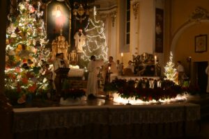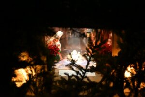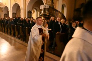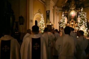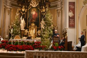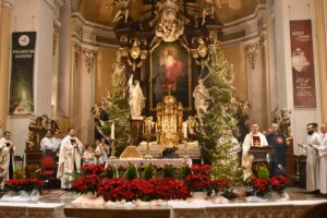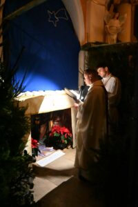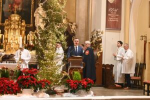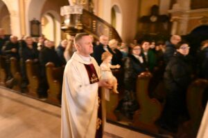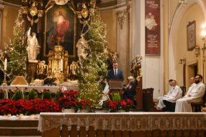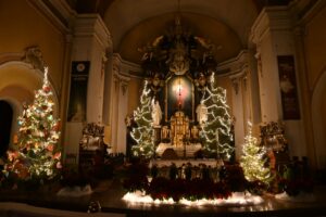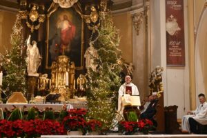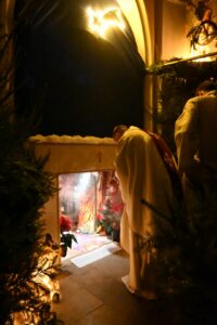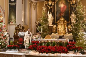 Ks. Krzysztof w kazaniu wygłoszonym podczas pasterki zachęcał do mocnego przytulenia się do Krzyża, będącego źródłem nadziei, tak jak to przedstawione jest w logo rozpoczętego właśnie przez papieża Franciszka Roku Jubileuszowego pod hasłem: Pielgrzymi Nadziei. Nasza tegoroczna szopka jest odzwierciedleniem drogi Pielgrzyma Nadziei i przenosi nas do Groty w Bazylice Narodzenia Pańskiego w Betlejem. Jak powiedział bł. Michał Sopoćko: "Całe życie człowieka jest wędrówką do Betlejem, bo całe życie jest wędrówką do oglądania Boga". Rozpoczęty rok łaski jest aby swoje życie rewitalizować. Bóg się narodził, jest zawsze wierny i do takiego życia zaprasza - kontynuował ksiądz Krzysztof.