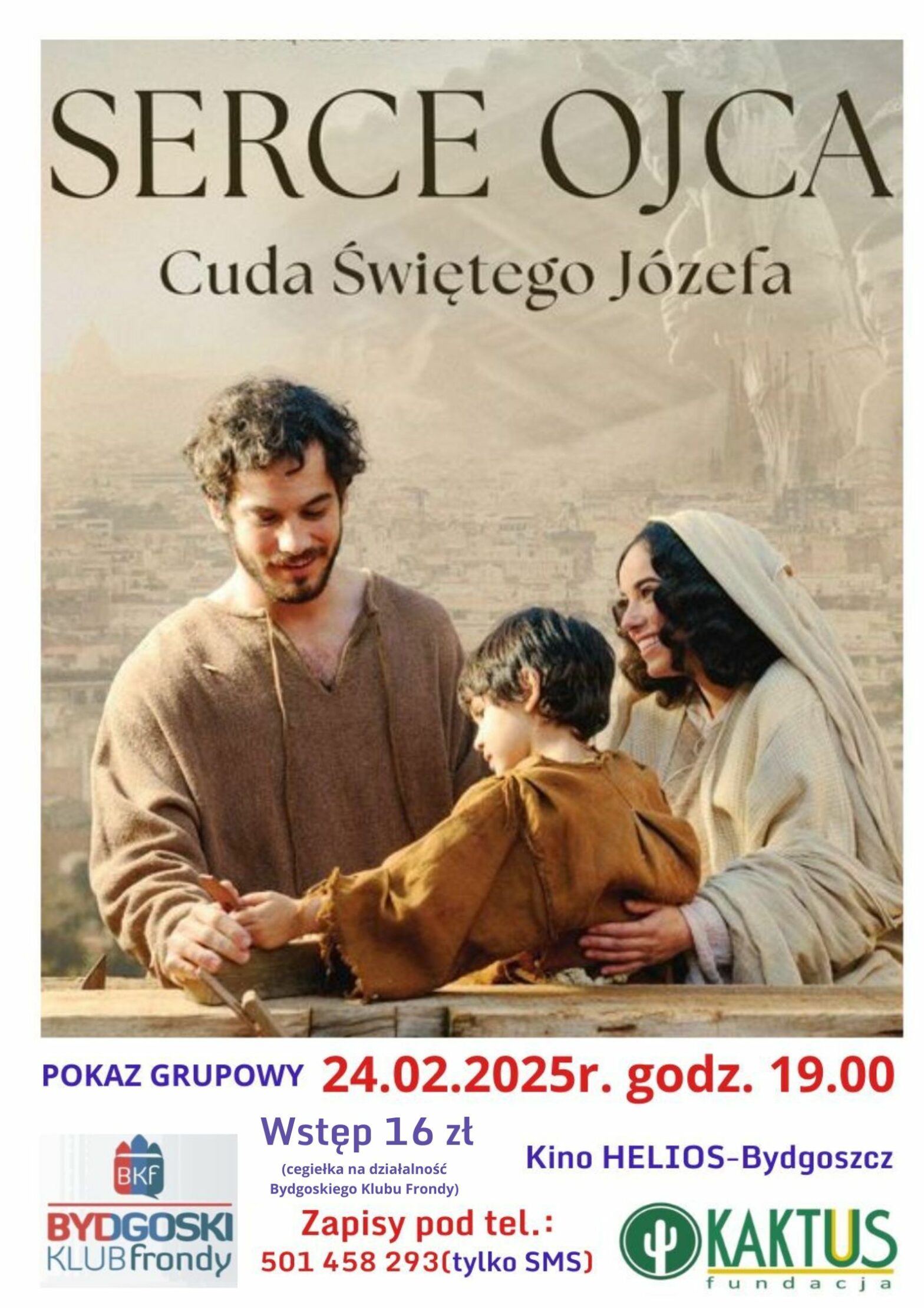 Bydgoski Klub Frondy zaprasza na projekcję filmu pt: „SERCE OJCA”, który opowiada o interwencji Św. Józefa w życiu ludzi. Projekcja odbędzie się w dniu 24 lutego (poniedziałek) o godz. 19.00 w Kinie HELIOS , BILETY-16 zł. zapisy pod Tel: 501 458 293(tylko SMS)