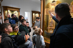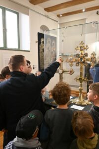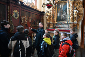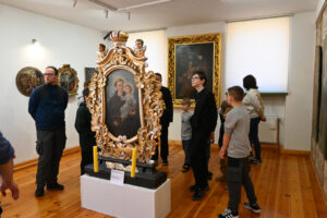 Pozostając w tematyce kościelnej zajrzeliśmy jeszcze do muzeum diecezjalnego, w którym znajdują się piękne ornaty z bogatymi zdobieniami, które mogą ważyć nawet 30 – 50 kg, naczynia liturgiczne oraz obraz, przy którym ks. Adam, który wspaniale opowiadał o oglądanych przez nas rzeczach zrobił krótką lekcję historii. Było to dzieło Jerzego Kossaka - „Cud nad Wisła”.