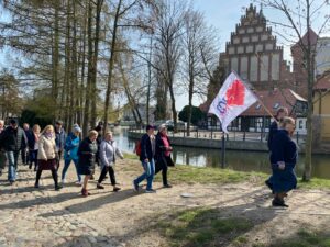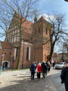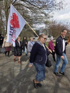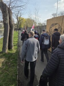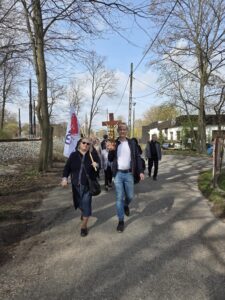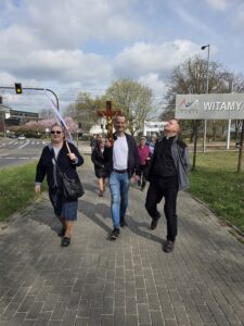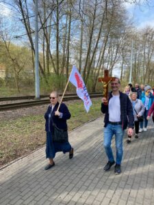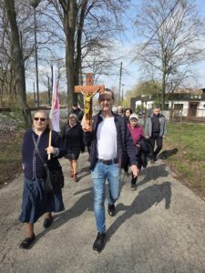 W drugą sobotę kwietnia ponad dwudziestu pielgrzymów wyruszyło z Domu Parafialnego do Sanktuarium. Tak jak poprzednio pielgrzymi szli za krucyfiksem i flagą naszej parafii. W drodze pielgrzymi wspólnie odmówili Różaniec Święty. Tuż przed kościołem do idących dołączyli kolejni pielgrzymi, którzy część drogi odbyli środkami komunikacji miejskiej.