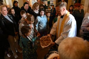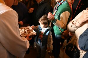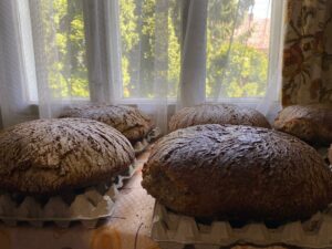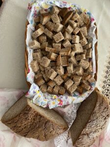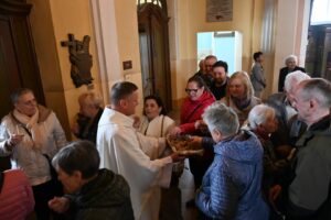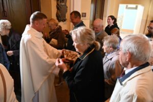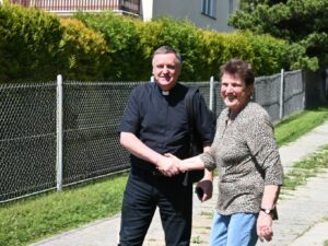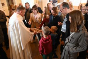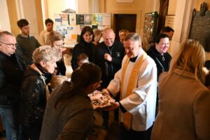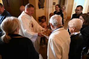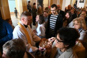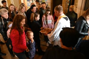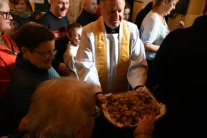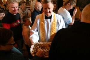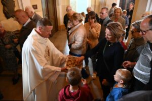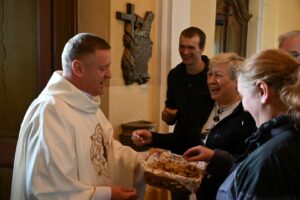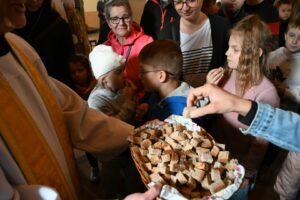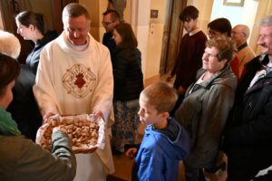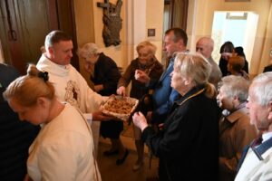 W niedzielę po Mszy św. o godz.10.30 oraz o 12.15 Ksiądz Krzysztof podzielił się z parafianami chlebem przywiezionym z Markowej, wypieczonym wg. tradycyjnej receptury w domu rodzinnym bł. Wiktorii Ulmy przez jej bratanka oraz jego żonę Urszulę. Dobro za dobro, miłość za miłość - tymi serdecznymi słowami przyjęli pielgrzymów w swoich progach.