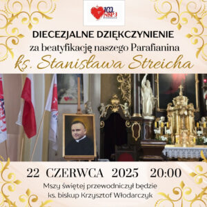 Już dzisiaj zapraszamy na Diecezjalne Dziękczynienie za beatyfikację naszego Parafianina, ks. Stanisława Streicha, które odbędzie się w naszym kościele w niedzielę, 22 czerwca o godz. 20:00.