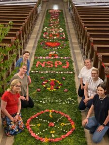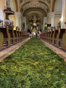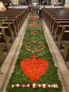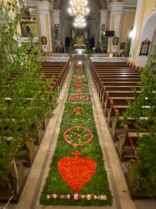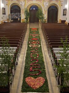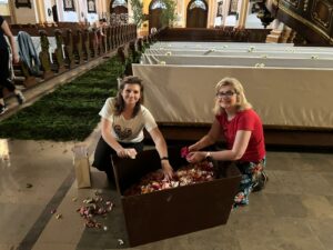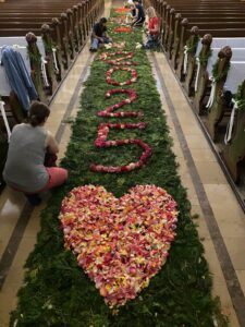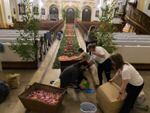 Tradycją w naszym kościele w Boże Ciało jest kwiatowy dywan, po którym przejdzie procesja z Najświętszym Sakramentem. W środę wieczorem, do późnych godzin, dywan był tworzony ze świeżych kwiatów.