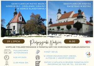 19 lipca o godz. 8.00 sprzed domu parafialnego wyruszy autokarowa Pielgrzymka do Sanktuarium Krzyża Świętego (Parafia pw. Wniebowzięcia NMP w Kcyni). oraz do Sanktuarium Matki Bożej Góreckiej – Królowej Krajny (Parafia pw. NMP Niepokalanie Poczętej w Górce Klasztornej). W Sanktuarium Matki Bożej Góreckiej o godz.11.00 pielgrzymi wezmą udział we Mszy św.