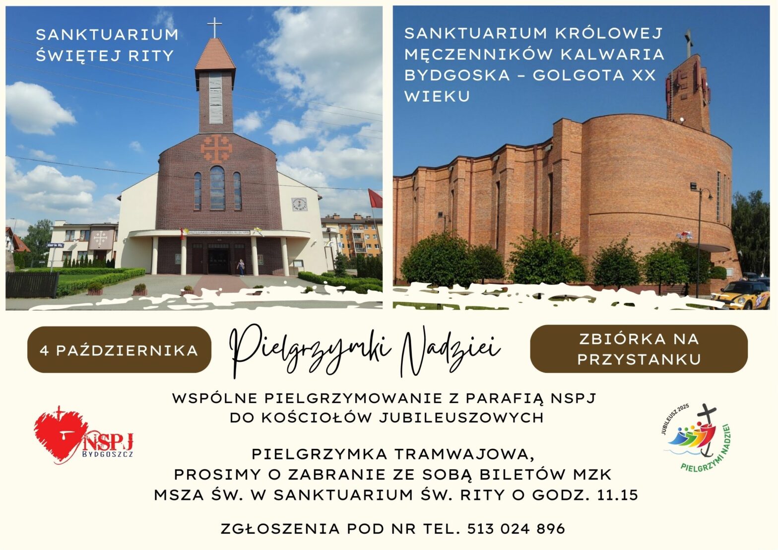 Pielgrzymka Nadziei do Sanktuarium Św. Rity i Sanktuarium Królowej Męczenników W sobotę 4 października spotykamy się na przystanku tramwajowym. Prosimy o zabranie ze sobą biletów MZK. Z przystanku Dworcowa/Matejki o 10:08 ruszamy tramwajem nr 5. Po 37 min ok 10:45 wysiadamy na przystanku Andersa/Gieryna. Stamtąd pieszo ok 5 min udajemy się do Sanktuarium św Rity. …