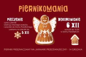 Zapraszamy do włączenia się w Piernikomanię, która w zeszłym roku przerosła nasze możliwości! Pierniki skończyły się o godz. 11.00. Nie pozwólmy, aby w tym roku zabrakło pierników dla tych, co wstają nieco później. Pierniki można przynosić do biura parafialnego do 5 grudnia, natomiast 6 grudnia odbędzie się wielkie dekorowanie.