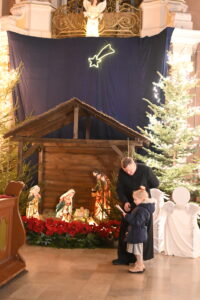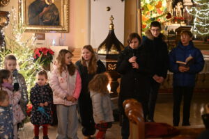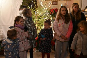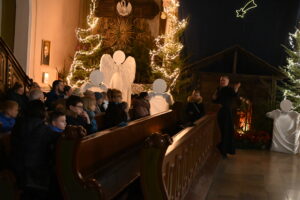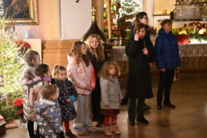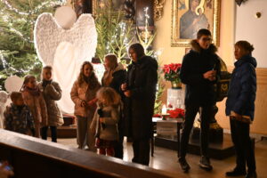 Dzieci, rodzice, dziadkowie 25 i 26 grudnia spotkali się przy żłóbku, aby wspólnie, rodzinnie kolędować. Cicha noc... Przybieżeli do Betlejem... Lulajże Jezuniu... – z radością śpiewały dzieci z pomocą dorosłych. Na koniec zebrani robili zdjęcia przy aniołach, aby w domu zatopić się w ciszy i rozważyć, czy ja jestem dla kogoś aniołem. Dla wszystkich obecnych nie mogło zabraknąć słodyczy od Księdza Krzysztofa i Księdza Marcina.