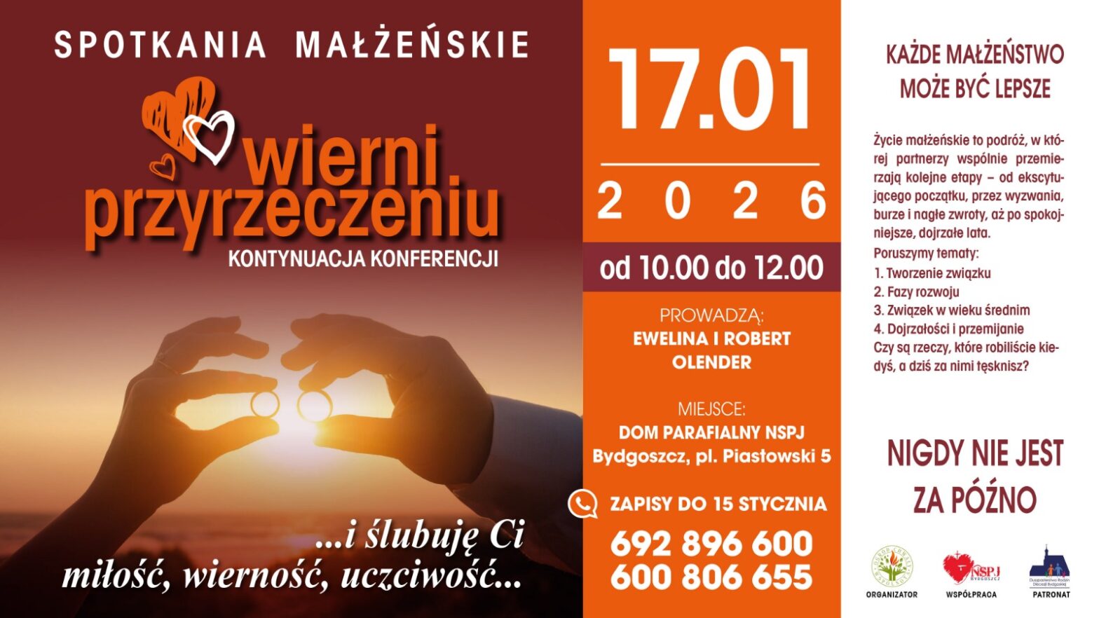 W sobotę 17 stycznia zapraszamy na kolejne spotkanie małżeństw. Nie byliście na pierwszym, drugim spotkaniu, nie szkodzi, można przyjść. Temat spotkania sobotniego: „Wierni przyrzeczeniu” Chcesz szczęścia w małżeństwie? Chcesz uzdrowić swoje małżeństwo? A może masz potrzebę podzielenia się radością płynącą ze swojego małżeństwa? PRZYJDŹ ZAPRASZAMY