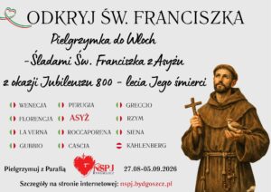 Zapraszamy na pielgrzymkę do Włoch śladami św. Franciszka z Asyżu z okazji Jubileuszu 800-lecia Jego śmierci w dniach 27 sierpnia - 5 września. Szczegóły na plakatach. Zapisy w Biurze Parafialnym z wpłatą 1000 zł.