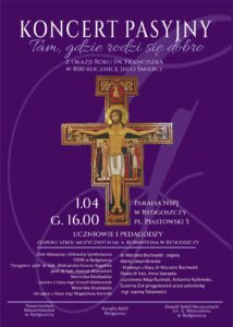 Już dzisiaj zapraszamy na koncert pasyjny „Tam, gdzie rodzi się dobro” w Roku Jubileuszowym 800-lecia śmierci św. Franciszka. Wykonawcami będą chór, orkiestra i soliści Państwowego Zespołu Szkół Muzycznych w Bydgoszczy. Koncert odbędzie się w Wielką Środę, 1 kwietnia, o godz. 16.00 w naszym kościele.