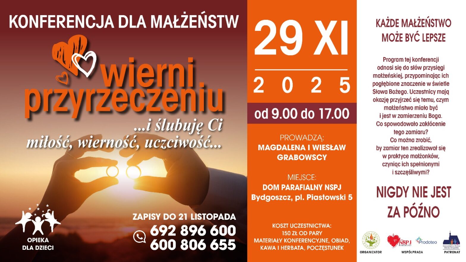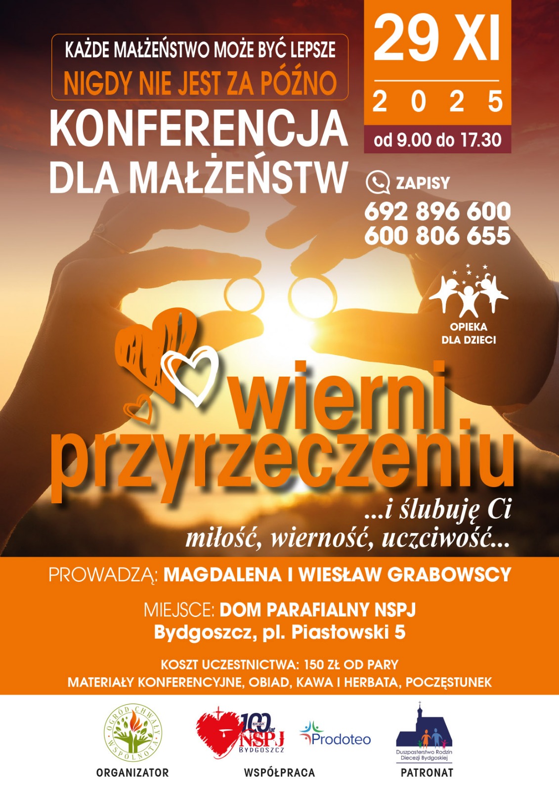 Serdecznie zapraszamy wszystkie małżeństwa, niezależnie od ich stażu małżeńskiego, na konferencję „Nigdy nie jest za późno”. Szczegóły na plakacie. Zapraszamy – każde małżeństwo może być lepsze