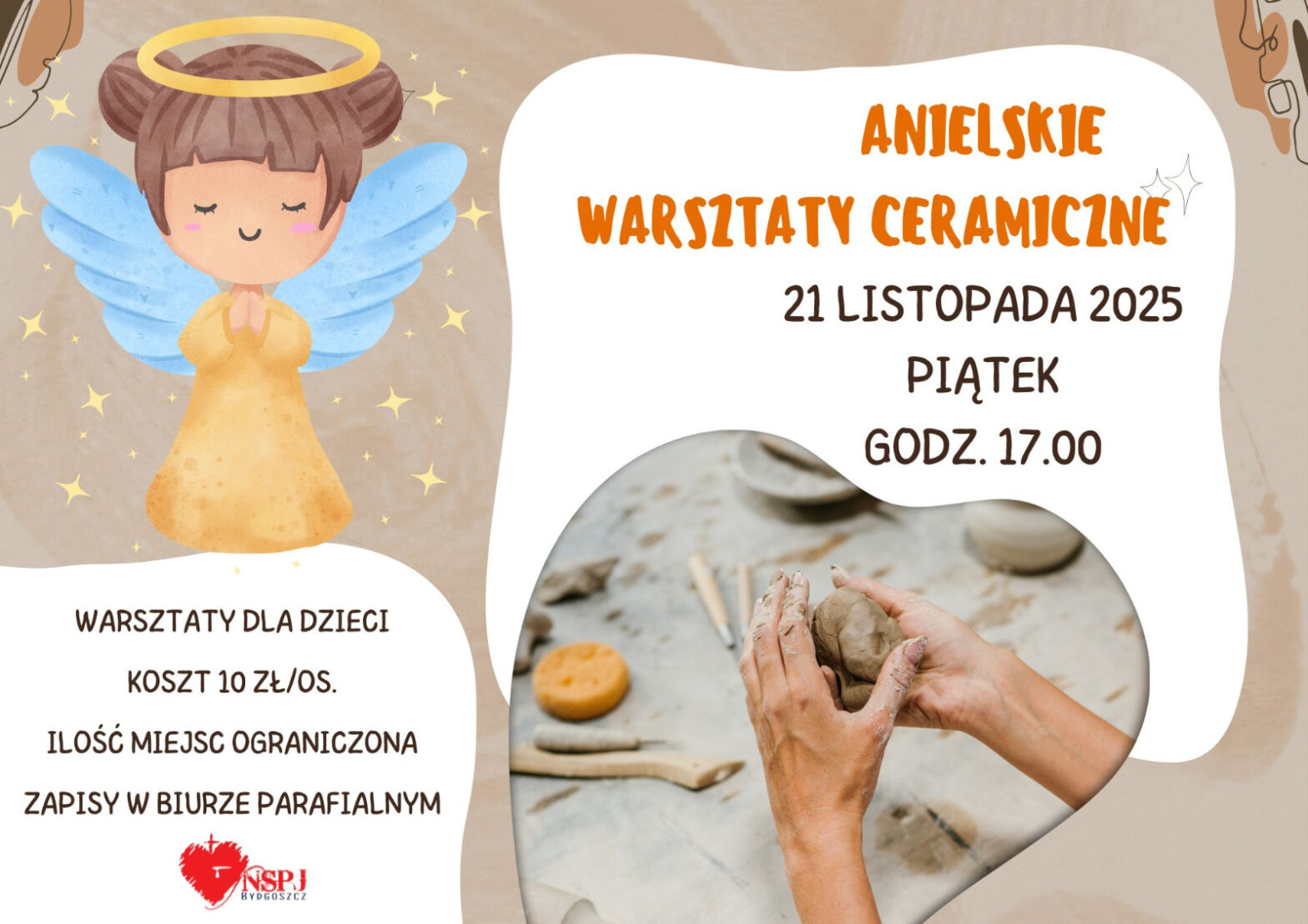 Serdecznie zapraszamy dzieci na Anielskie Warsztaty Ceramiczne. Będzie możliwość wykonywania własnego aniołka w glinie. Ilość miejsc ograniczona. Szczegóły na plakacie.