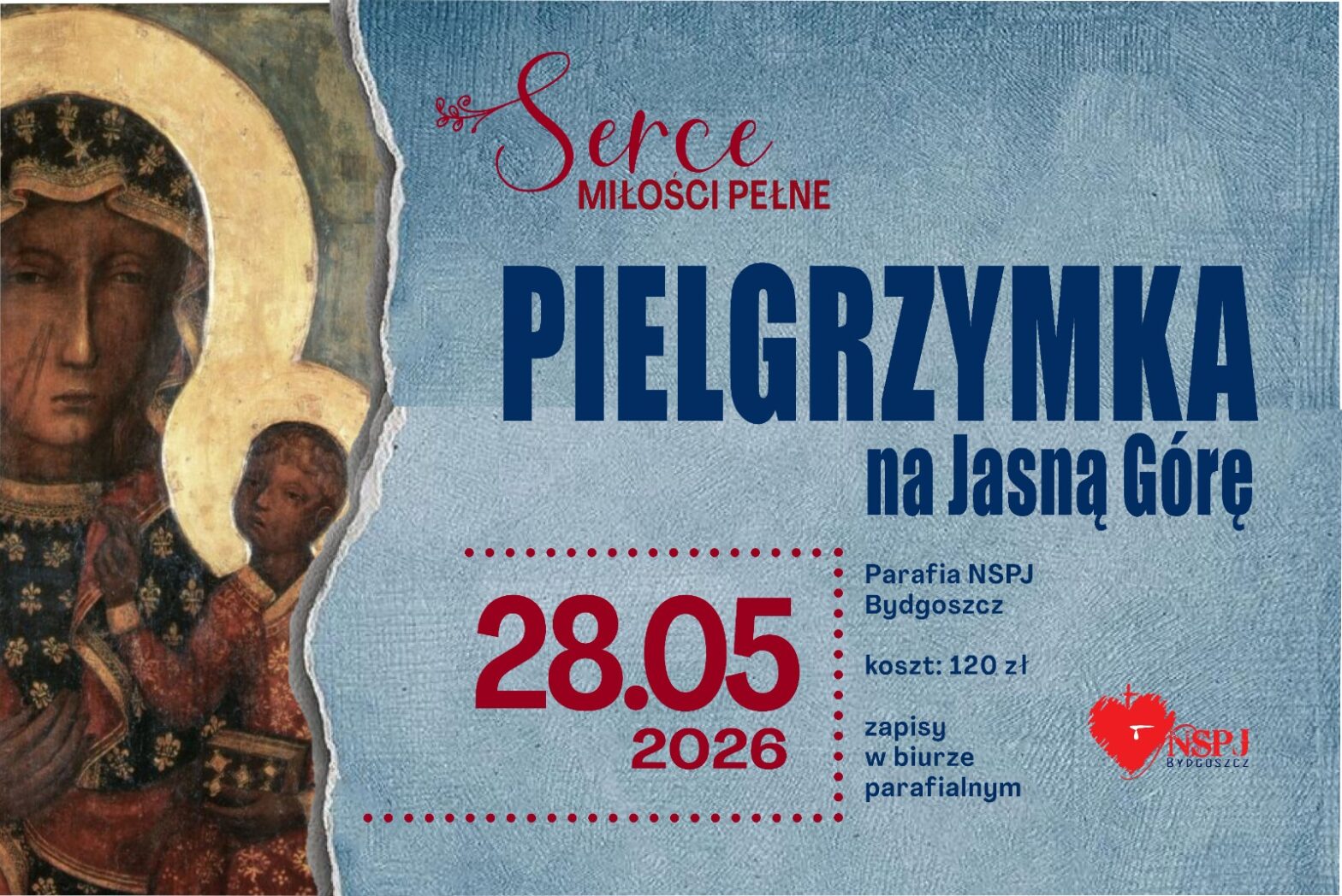 Parafialna pielgrzymka na Jasną Górę odbędzie się 28 maja (czwartek). Zapisy w Biurze Parafialnym. Koszt 120 zł. W programie: o godz. 13.30 Msza św. w kaplicy Cudownego Obrazu, zwiedzanie klasztoru oraz Apel Jasnogórski.