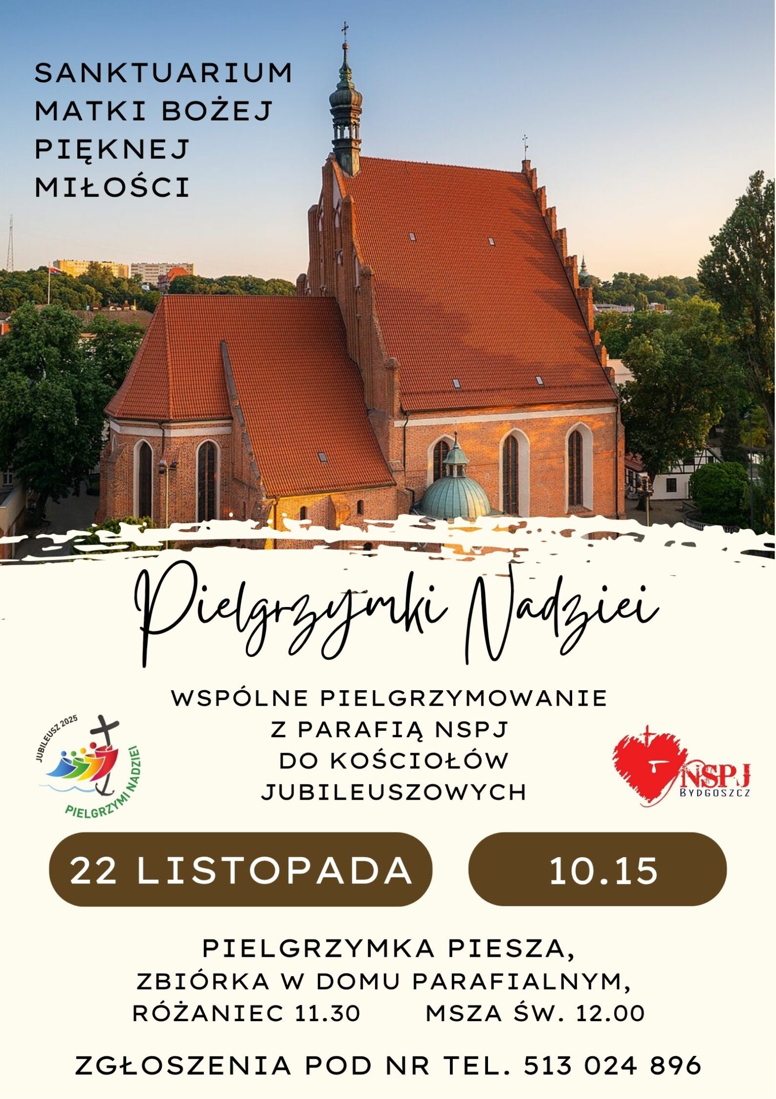 Zapraszamy do wspólnego pielgrzymowania do Kościołów Jubileuszowych Diecezji Bydgoskiej. Przed nami 10 – ostatni Kościół Jubileuszowy Diecezji Bydgoskiej. 22 listopada spotykamy się o godz. 10.15 w domu parafialnym, skąd po modlitwie wyruszymy pieszo do Sanktuarium Matki Bożej Pięknej Miłości (Parafia Katedralna pw. św. Marcina i św. Mikołaja w Bydgoszczy). Rozpoczęcie w Katedrze o godz.11.00, różaniec …